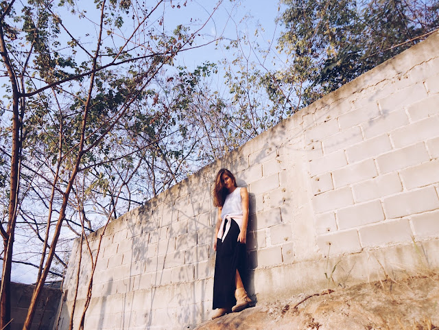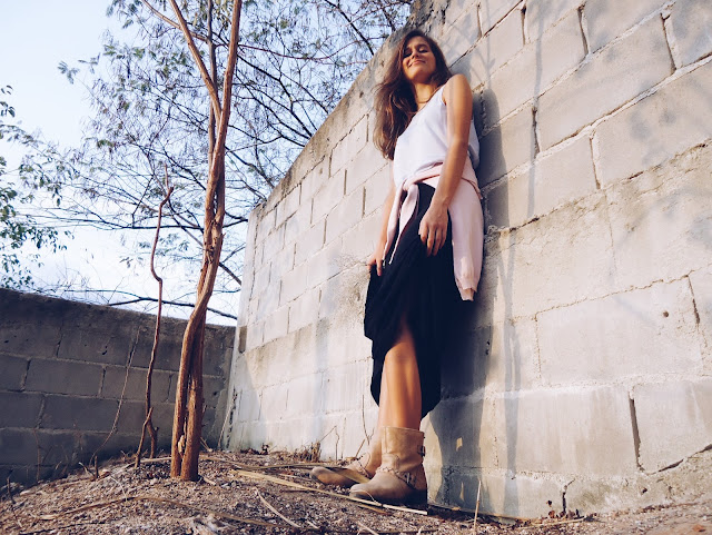 Nesse editorial eu peguei uma saia longa que eu acho super difícil de combinar – o que não faz o menor sentido porque ela é preta – e fiz um look versátil com blusinha e um suéter em tons pastéis, e uma bota de cano curto que é minha fiel escudeira nos dias de chuva.