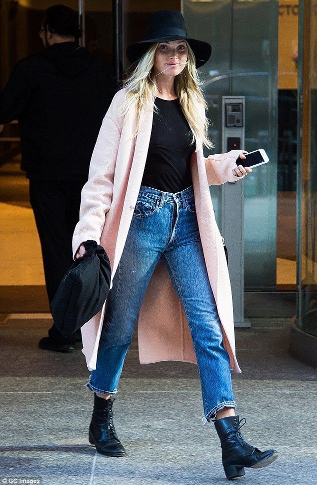 3. Model Off Duty com look preto, chapéu e um sobretudo de lei rosa pra quebrar a combinação básica.